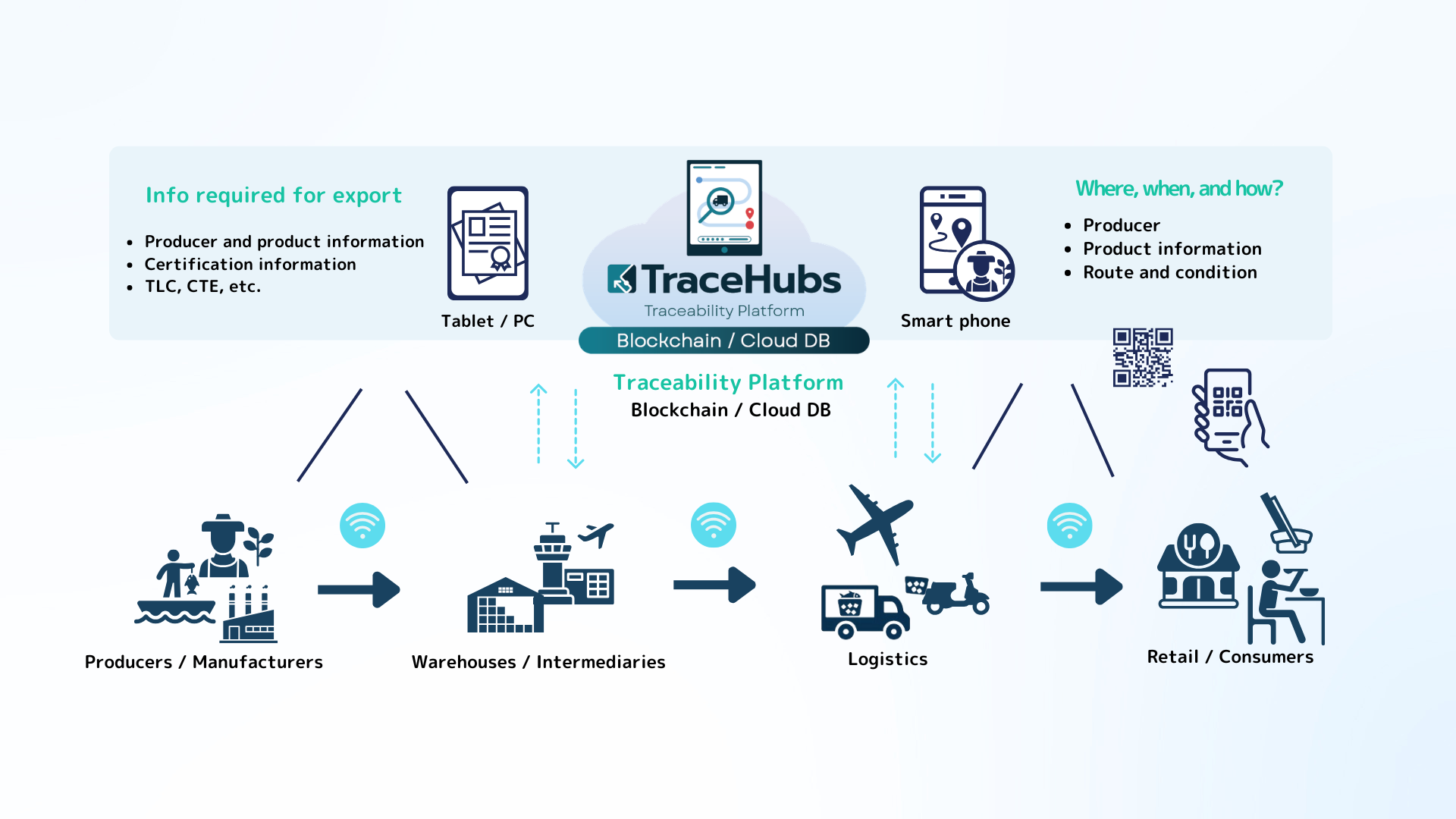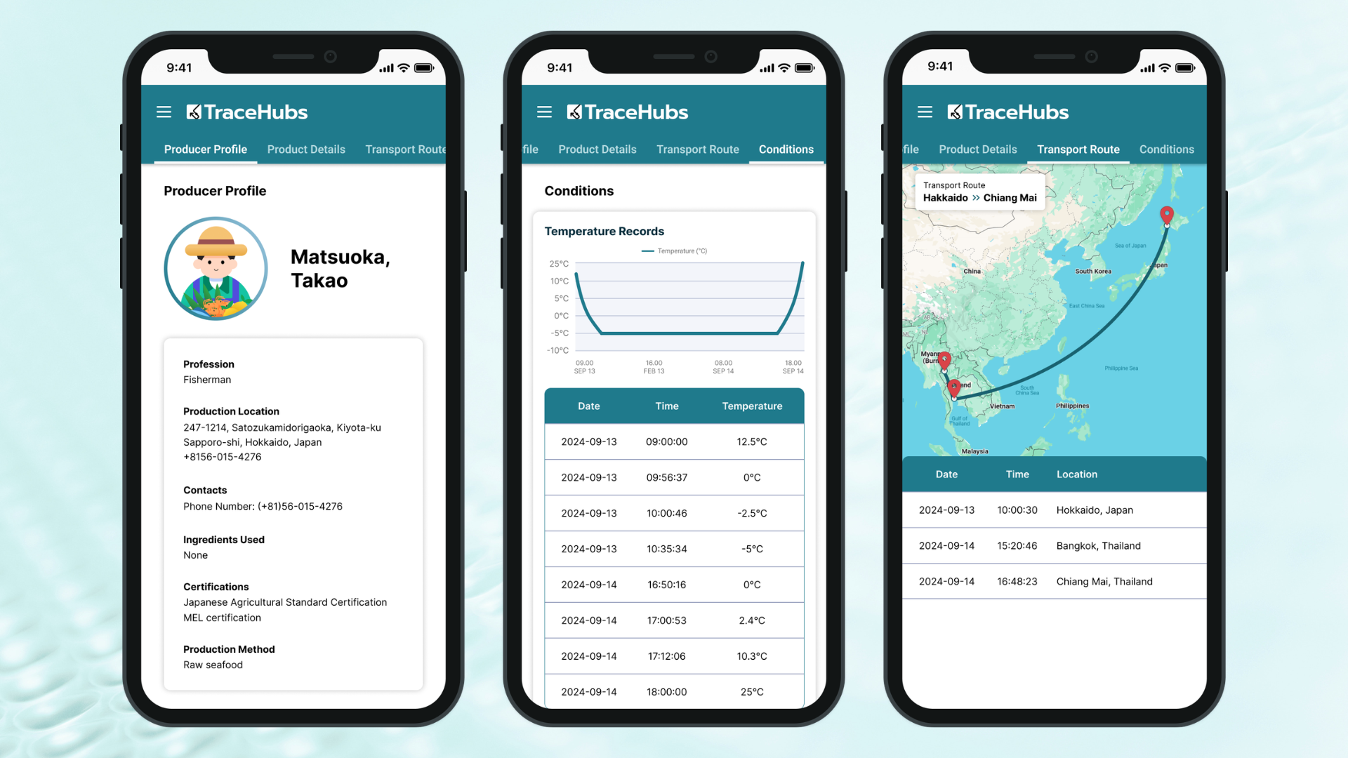A system integrates cold storage boxes, tracking tags, and blockchain technology to visualize and manage producer information, product details, transport routes, and temperature in real time.